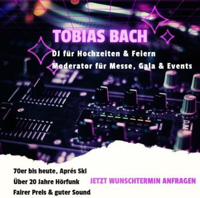 DJ Tobias Bach steht für die perfekte Mischung aus Musik und Stimmung und begleitet Events professionell von der ersten Minute bis zum letzten Beat. In der Region Pellenz sowie im gesamten Raum MYK, KO, NR, WW, RLP, NRW und dem Saarland sorgt er dafür, dass Veranstaltungen nicht nur gut klingen, sondern sich auch genau richtig anfühlen.
