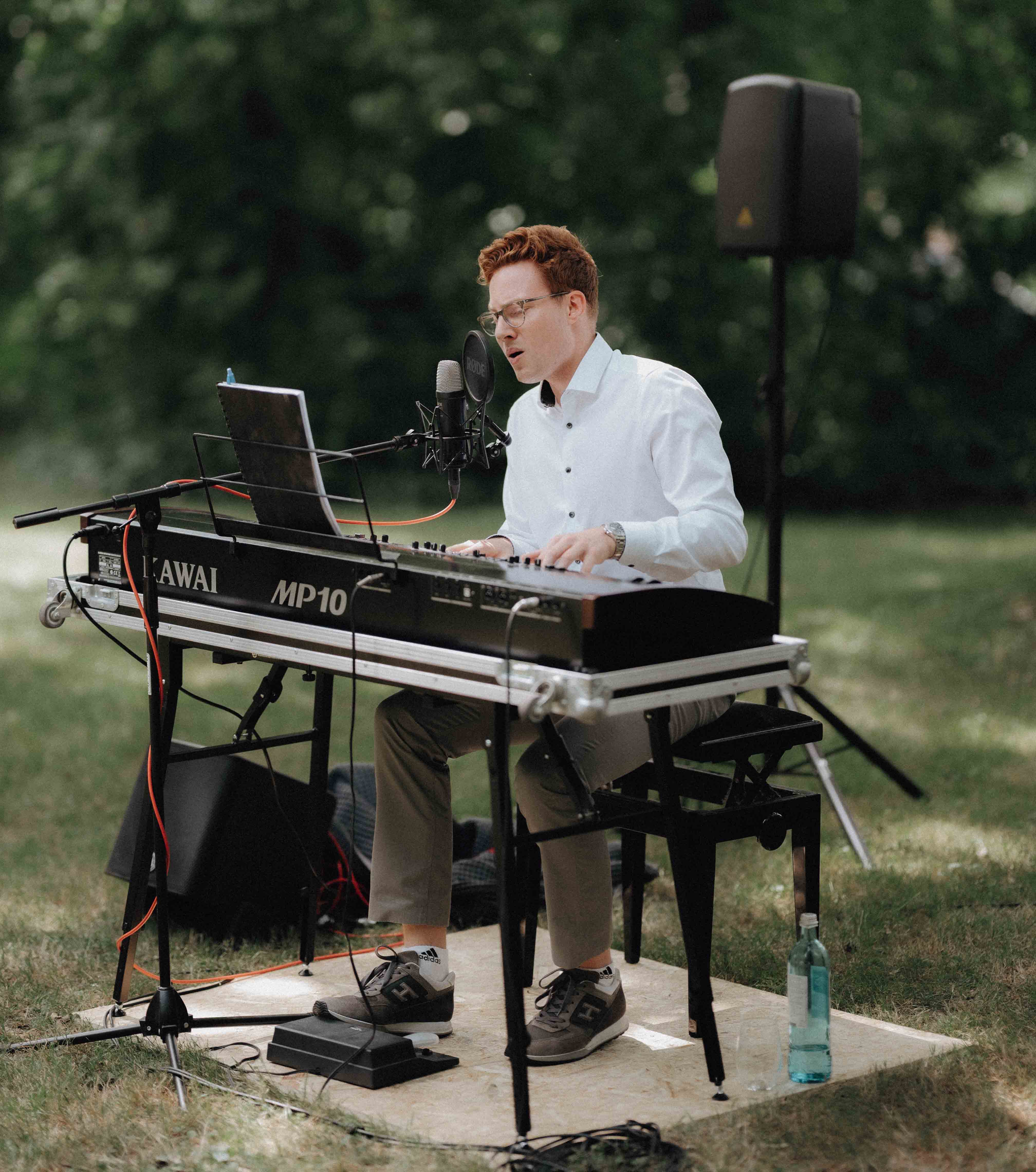 Gerne studiert er auch persönliche Wunschsongs ein, um den Anlass noch individueller zu gestalten. Bei Bedarf bringt er sein eigenes Equipment, bestehend aus E-Piano, Mikrofonierung und PA-Anlage, selbstverständlich mit.