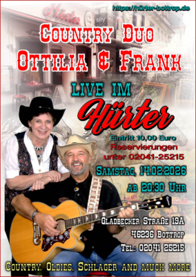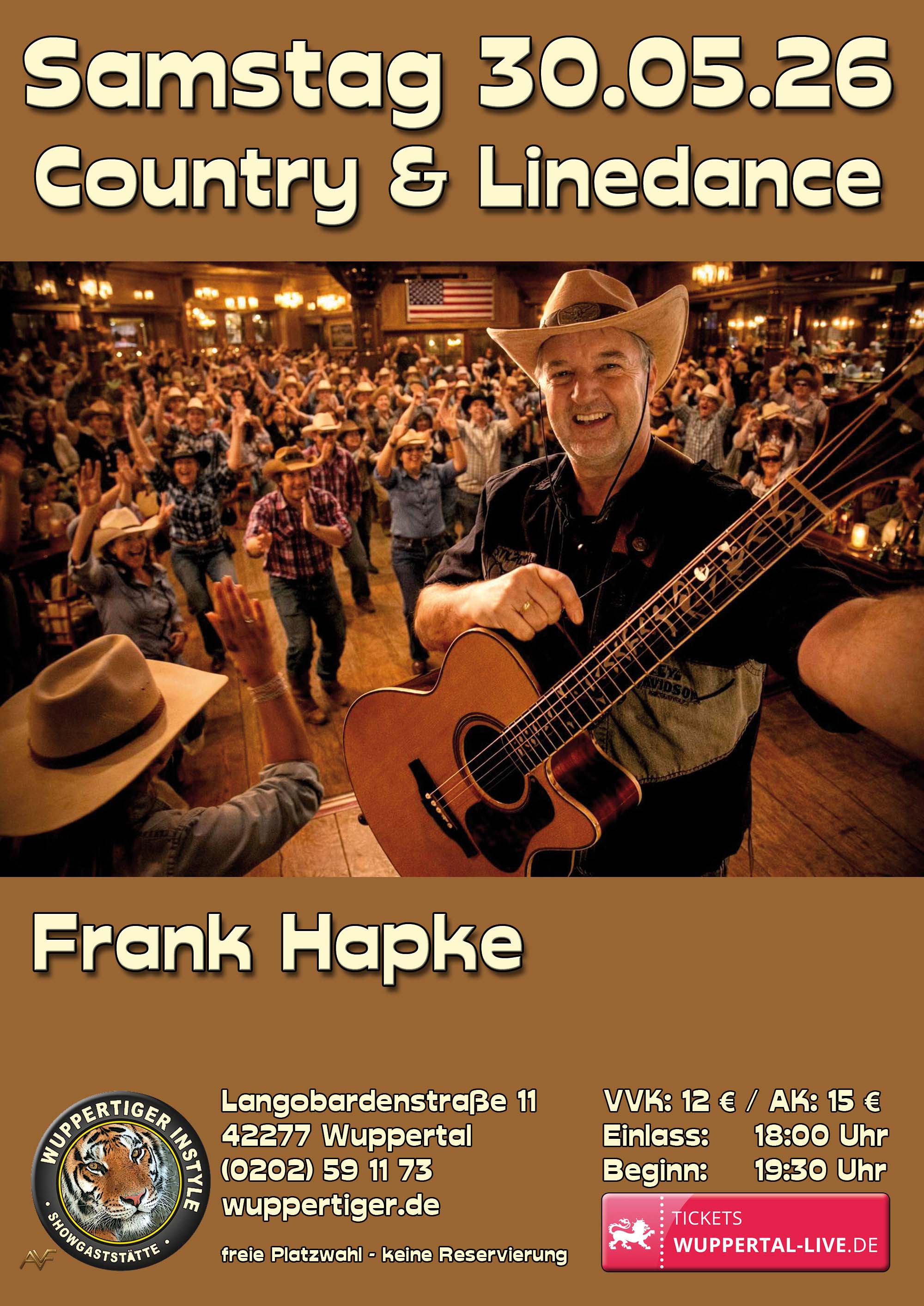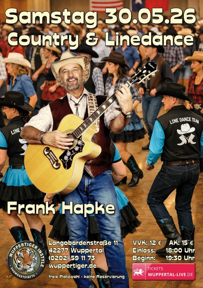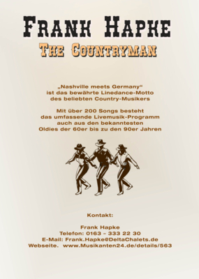 Mit dem erfahrenen COUNTRY-Musiker "Frank Hapke” erwartet Sie ein interessantes Livemusik-Programm zum TANZEN. Eine Symbiose aus traditionellen wie modernen Countrysongs, Country-Rock, Oldies, Honky Tonk, Bluegrass, Rockabilly, Irish Folk, Rock.Oldies, aktuelle USA-Country-Charts und auf Wunsch auch deutsche Kultschlager, sowie gefühlvolle Balladen und Eigenkompositionen. Klassisch traditionelle COUNTRY-Songs oder aktuelle USA-Chartbreaker, alles was der große Stimmumfang gesanglich zulässt und Spaß macht, wird mit Akustik-Gitarren und zu eigenen Backings live gesungen wie auch Unplugged mit Gitarre begleitet.