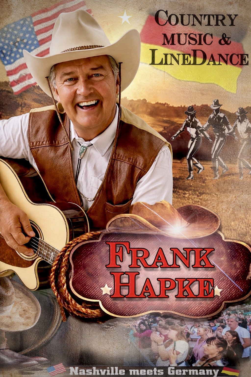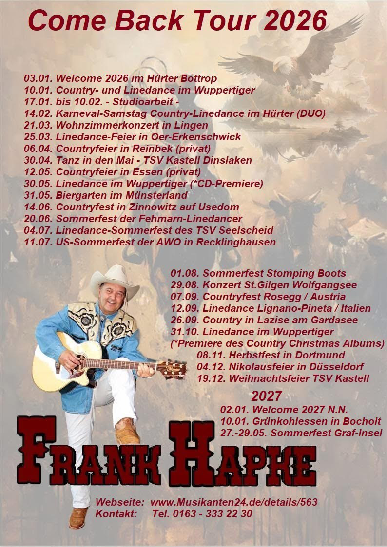 Countrymusiker Frank Hapke aus 46244 Bottrop-Kirchhellen, (Nordrhein-Westfalen) ist 2026 in ganz Deutschland, im September auch wieder in Österreich und Italien "on Tour" unter anderem auch für folgende Länder buchbar: Europa, Südafrika, Canada und USA