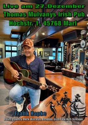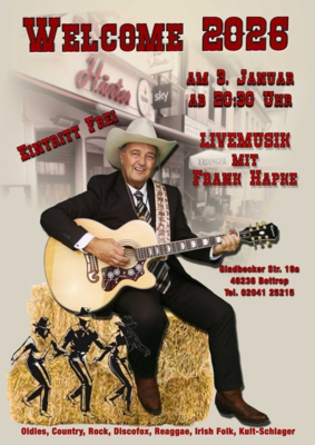 Mit dem erfahrenen COUNTRY-Musiker "Frank Hapke” erwartet Sie eine interessantes Livemusik-Programm, ein Symbiose aus traditionellen wie modernen Countrysongs, Country-Rock, Oldies, Honky Tonk, Bluegrass, Rockabilly, Irish Folk, Rock.Oldies, auf Wunsch auch deutsche Kultschlager, sowie gefühlvolle Balladen und Eigenkompositionen.
